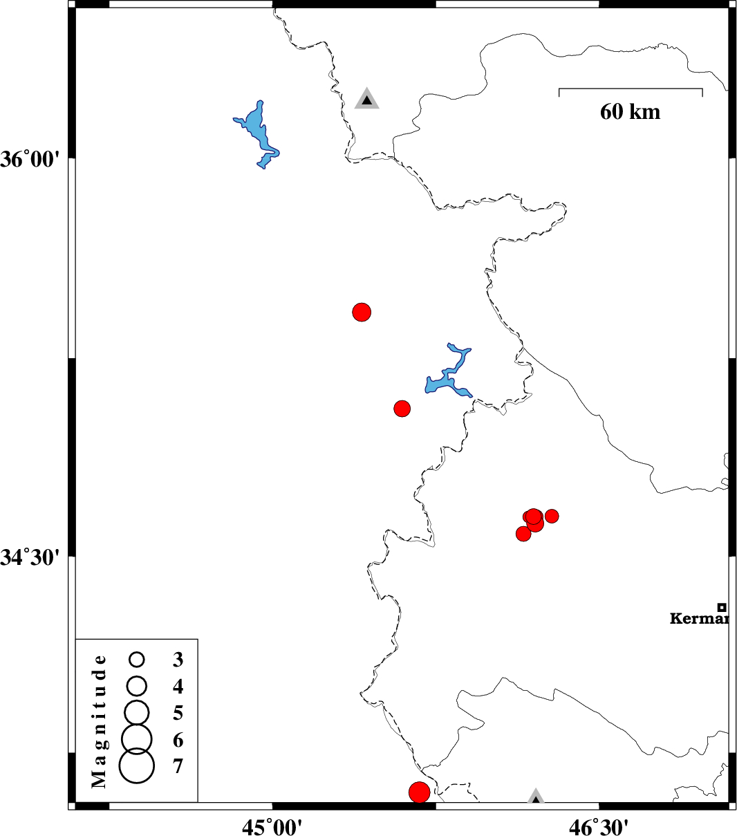 | 2018/09/17 | 21:06:36.3 | 01:36:36.3 | 34.65 | 46.209 | 6 | ML:2.9 | Kermanshah Province, 30 km South-West of Javanrud | ||