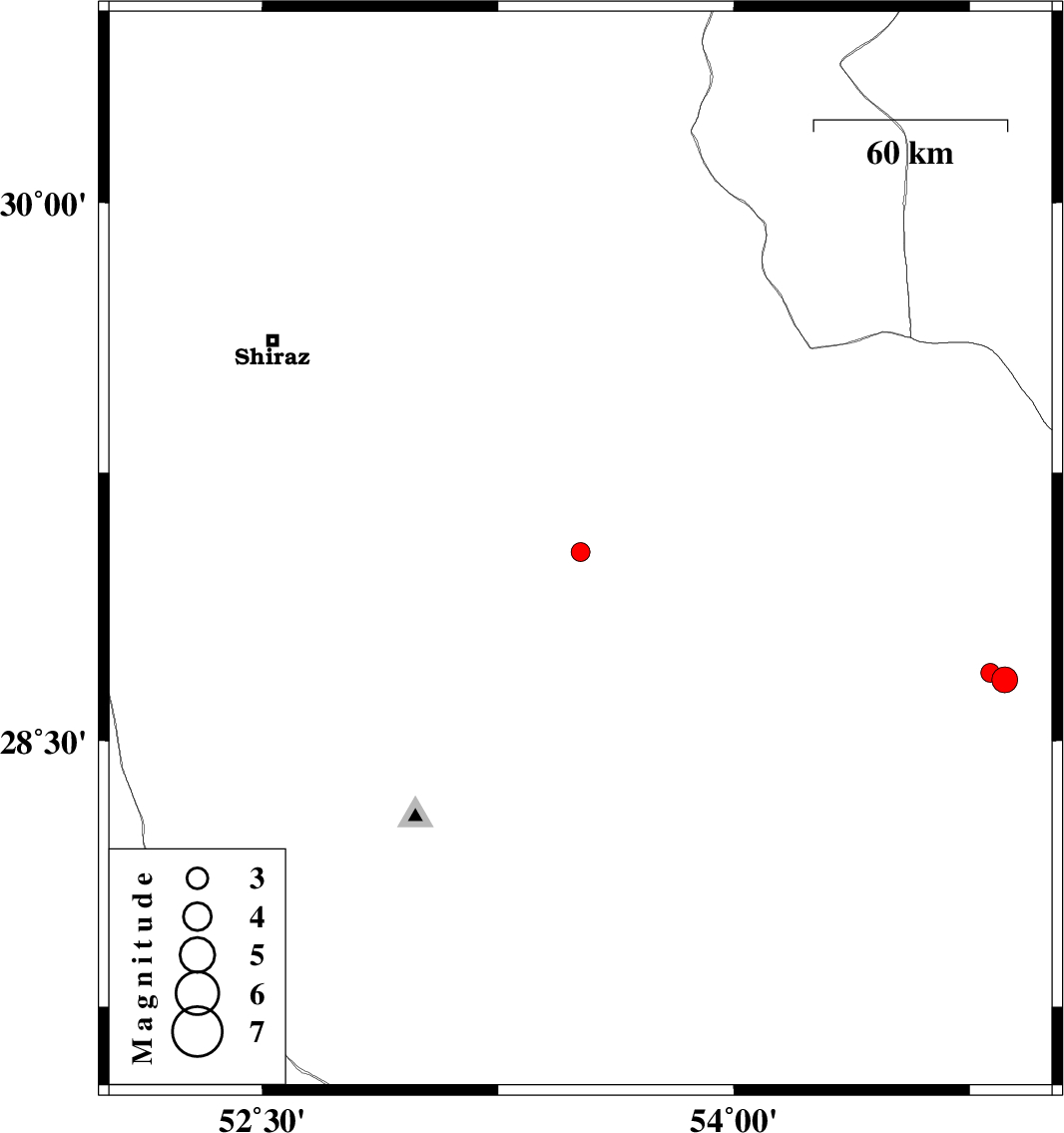 | 2018/09/15 | 21:37:56.5 | 02:07:56.5 | 28.67 | 54.861 | 14 | ML:3.7 | Fars Province, 33 km -East of Darab | ||