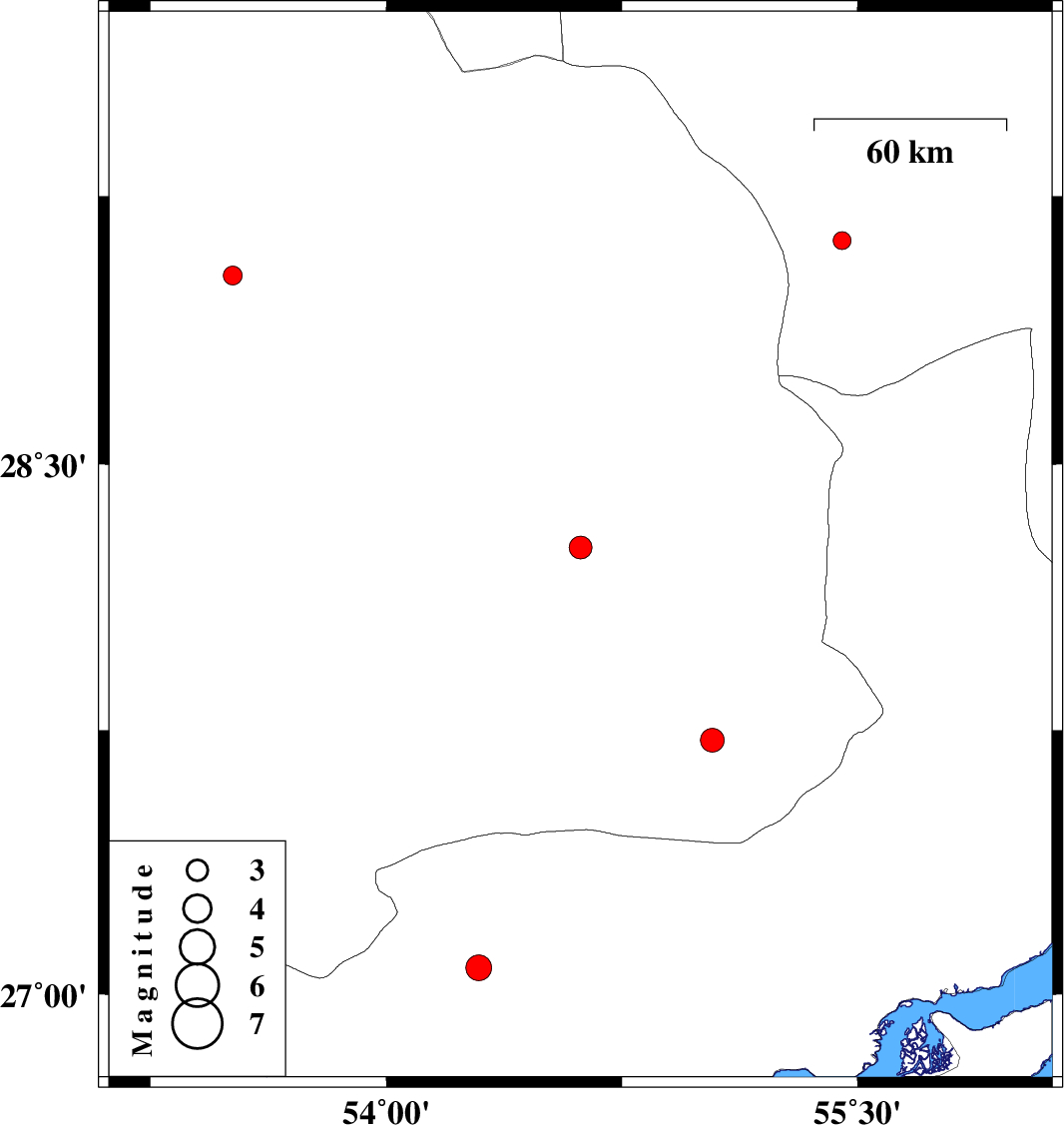 | 2018/09/23 | 03:53:02.5 | 07:23:02.5 | 27.722 | 55.038 | 14 | ML:3.4 | Fars Province, 69 km -East of Lar |