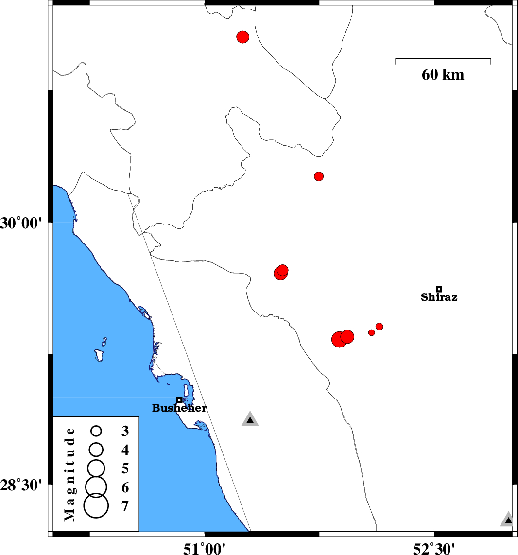 | 2018/09/23 | 05:22:56.6 | 08:52:56.6 | 29.332 | 51.882 | 15 | ML:4.7 | Fars Province, 39 km South-East of Kazerun |