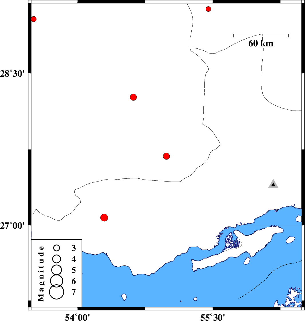 | 2018/09/29 | 09:08:17.2 | 12:38:17.2 | 27.075 | 54.295 | 15 | ML:3.6 | Hormozgan Province, 15 km South of Bastak | ||