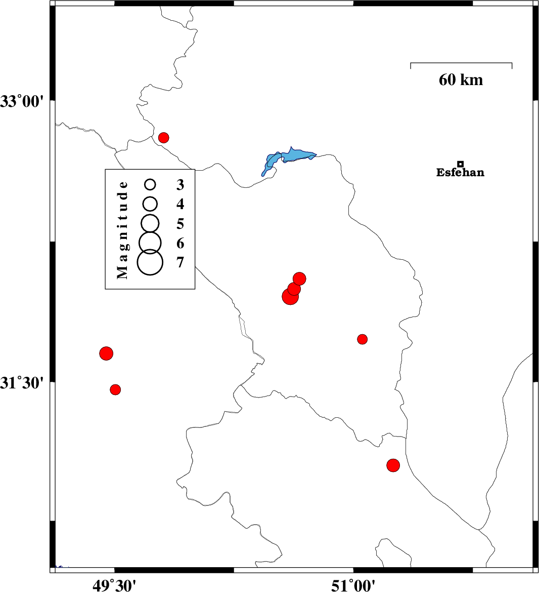 | 2018/09/04 | 18:14:42.3 | 22:44:42.3 | 32.801 | 49.808 | 14 | ML:3 | Esfahan Province, 32 km South-West of Fereydunshahr |