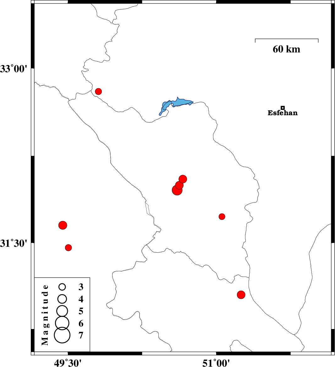 | 2018/09/04 | 18:14:42.3 | 22:44:42.3 | 32.801 | 49.808 | 14 | ML:3 | Esfahan Province, 32 km South-West of Fereydunshahr |
