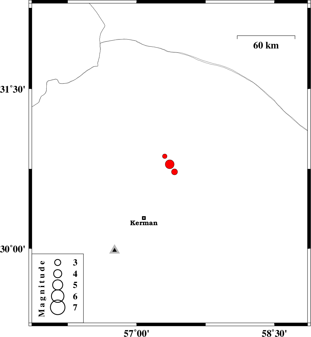 | 2018/09/29 | 18:17:57.3 | 21:47:57.3 | 30.723 | 57.413 | 14 | ML:3 | Kerman Province, 58 km North-East of Kerman |