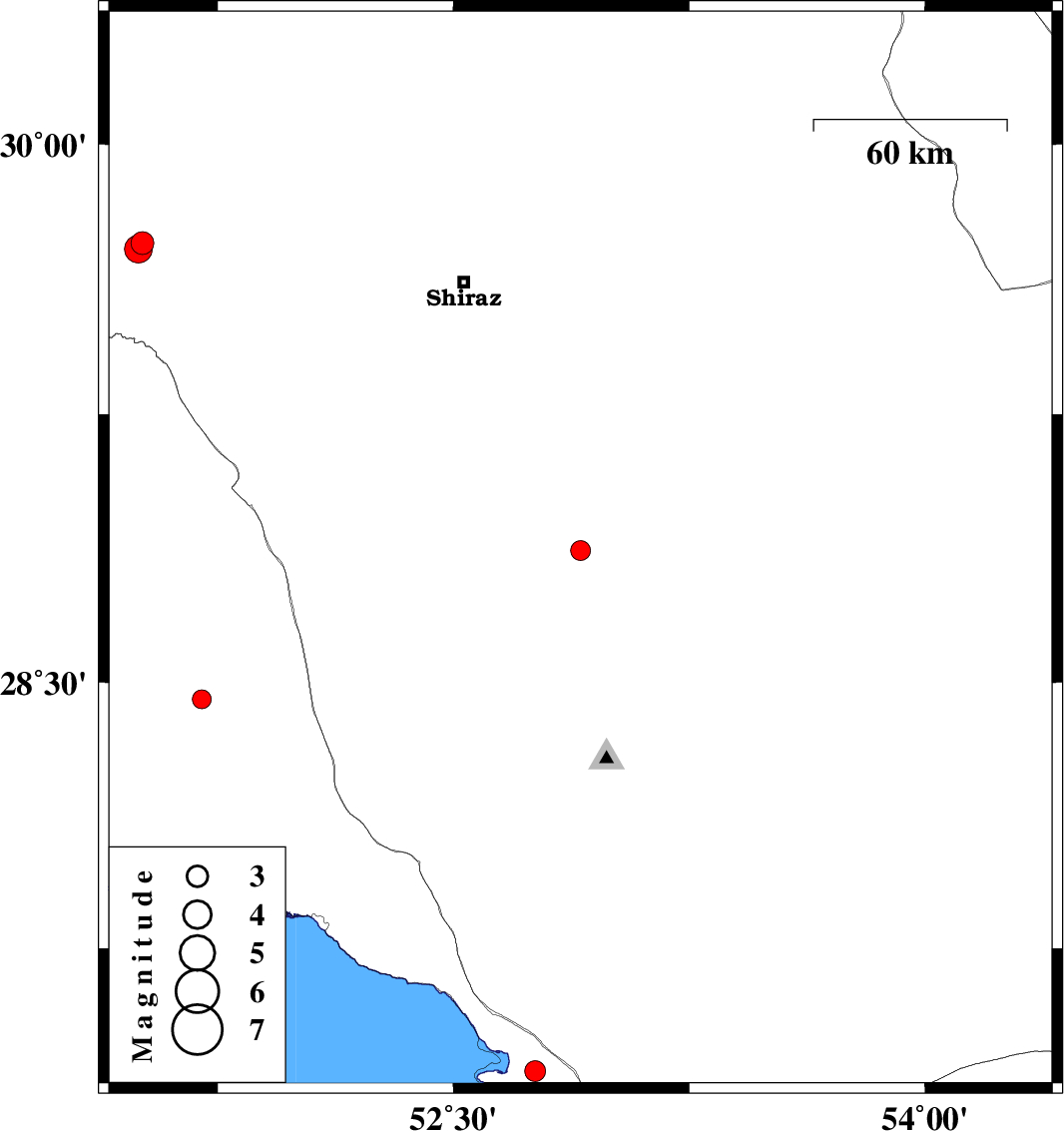 | 2018/10/01 | 08:40:53.9 | 12:10:53.9 | 27.402 | 52.76 | 14 | ML:2.9 | Bushehr Province, 20 km South-West of Mehr | ||