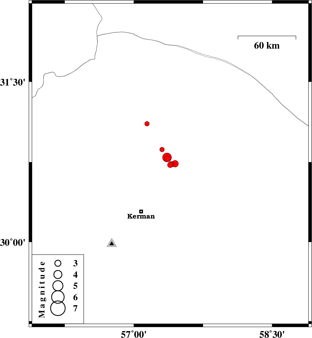 | 2018/10/06 | 00:29:58.9 | 03:59:58.9 | 31.109 | 57.142 | 14 | ML:2.3 | Kerman Province, 36 km South-East of Ravar | ||