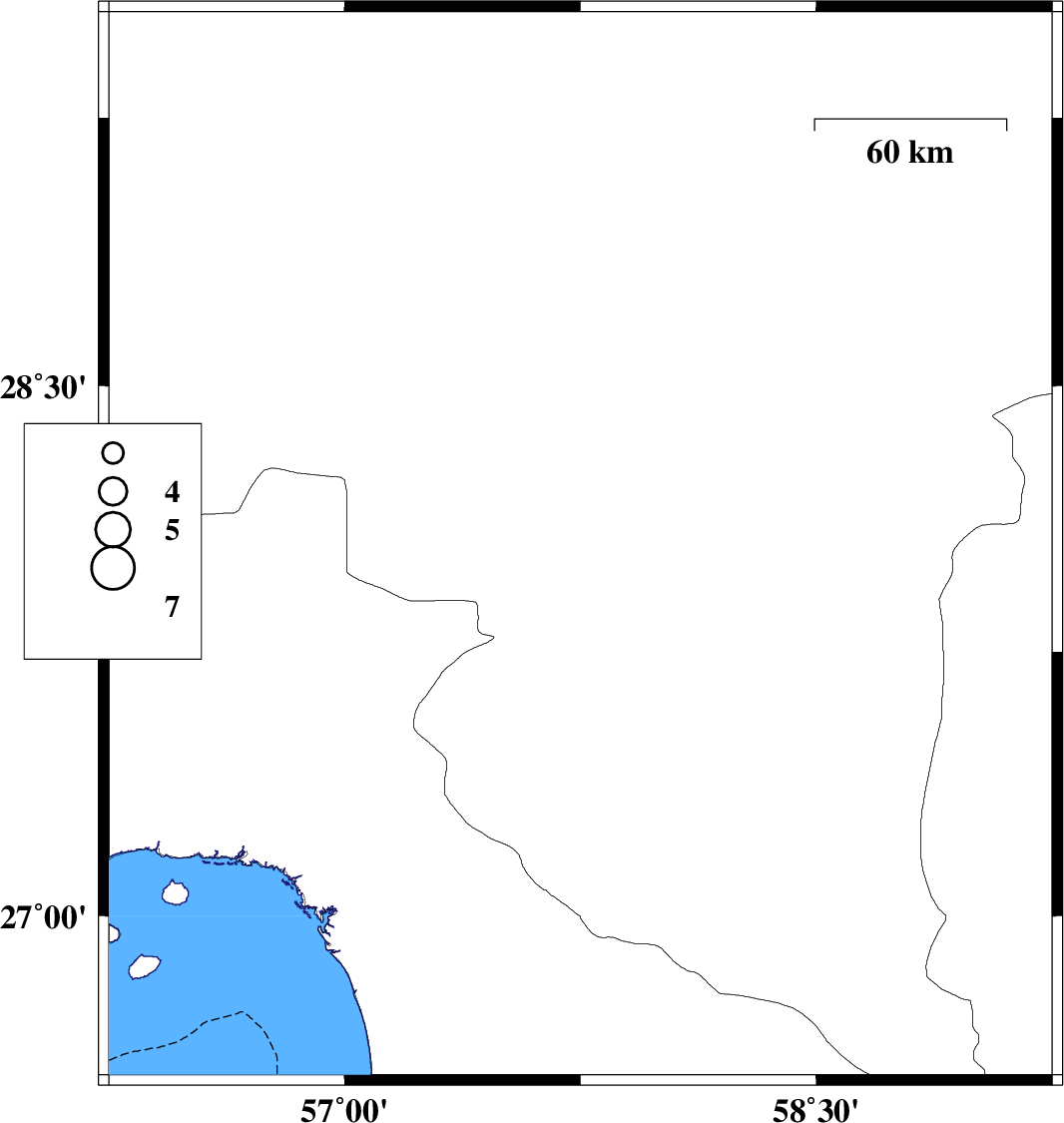 | 2018/10/09 | 16:58:58.7 | 20:28:58.7 | 27.806 | 57.465 | 15 | ML:2.8 | Kerman Province, 28 km South-West of Kahnuj | ||