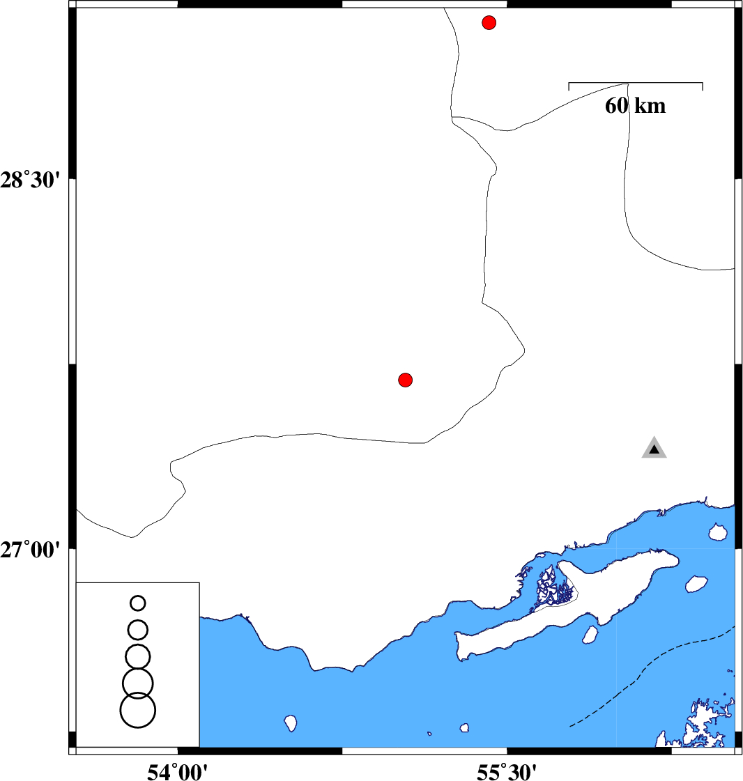 | 2018/10/15 | 15:09:06.2 | 18:39:06.2 | 27.686 | 55.037 | 14 | ML:2.8 | Fars Province, 69 km -East of Lar | ||