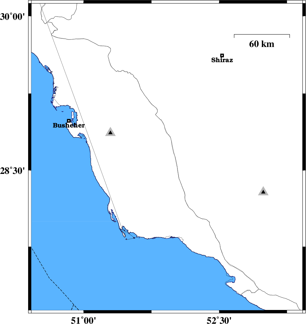 | 2018/10/18 | 23:28:24.6 | 02:58:24.6 | 27.274 | 52.731 | 14 | ML:2.5 | Bushehr Province, 34 km South-West of Mehr | ||