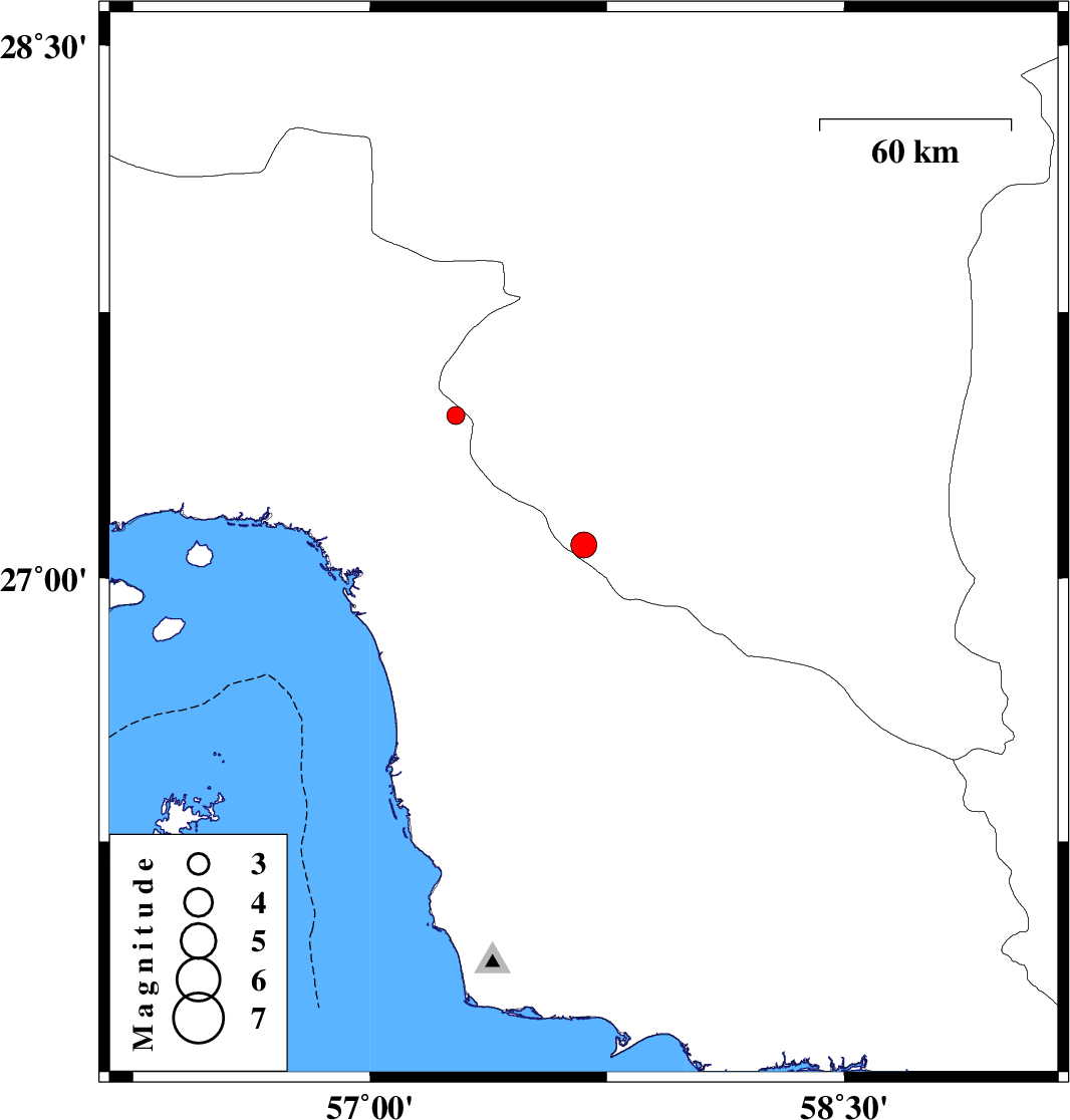 | 2018/10/24 | 15:13:40.2 | 18:43:40.2 | 27.093 | 57.676 | 7 | ML:3.6 | Kerman Province, 40 km South-East of Manujan | ||