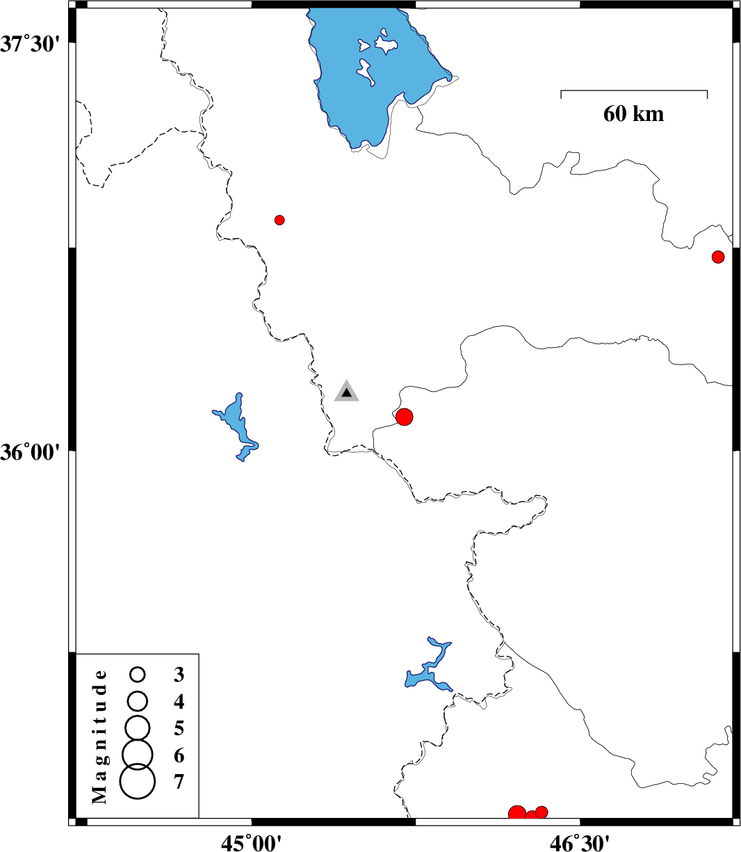 | 2018/10/25 | 07:30:27.1 | 11:00:27.1 | 36.125 | 45.697 | 14 | ML:3.5 | Kurdistan Province, 21 km -East of Sardasht | ||