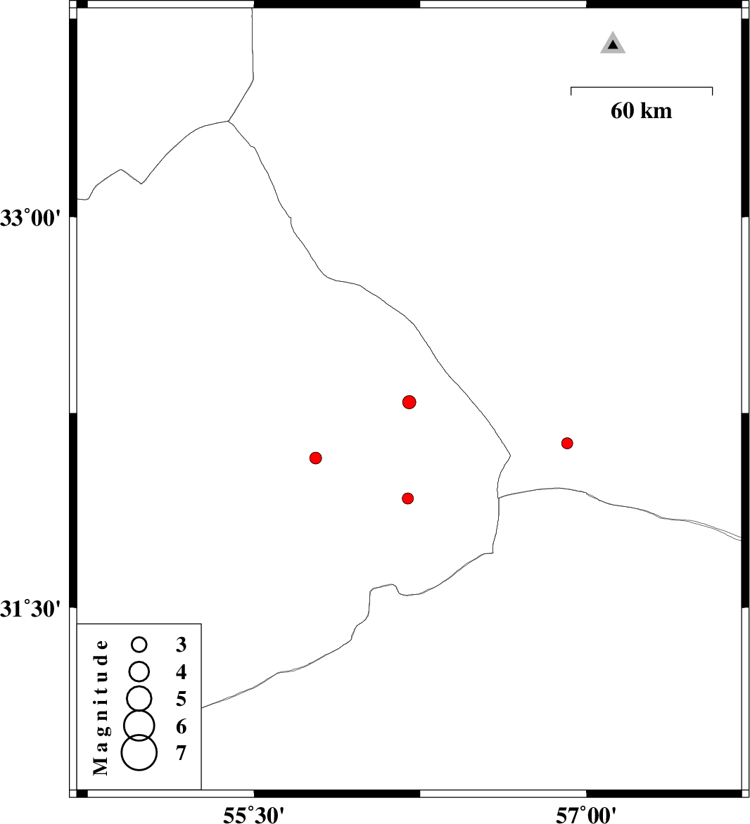 | 2018/10/27 | 00:40:30.1 | 04:10:30.1 | 32.292 | 56.2 | 14 | ML:2.7 | Yazd Province, 108 km North-East of Bafq | ||