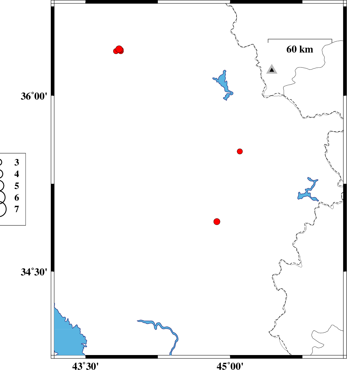 | 2018/10/27 | 19:48:28.3 | 23:18:28.3 | 35.285 | 44.724 | 14 | ML:2.5 | Iraq, 72 km South-West of Sulaymaniyah | ||