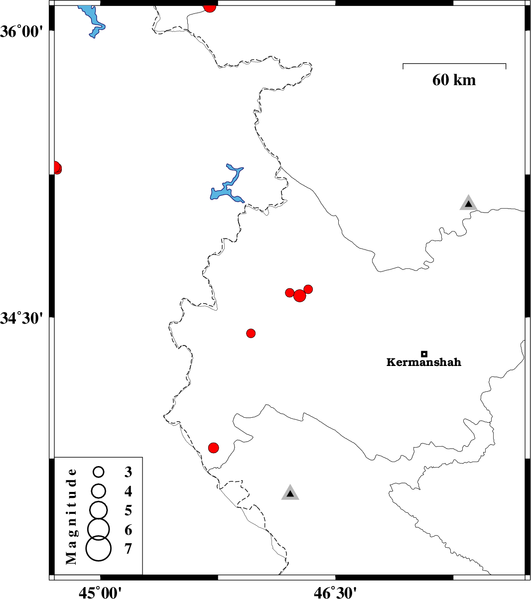 | 2018/10/23 | 00:38:08.9 | 04:08:08.9 | 34.647 | 46.325 | 14 | ML:2.6 | Kermanshah Province, 23 km South-West of Javanrud |