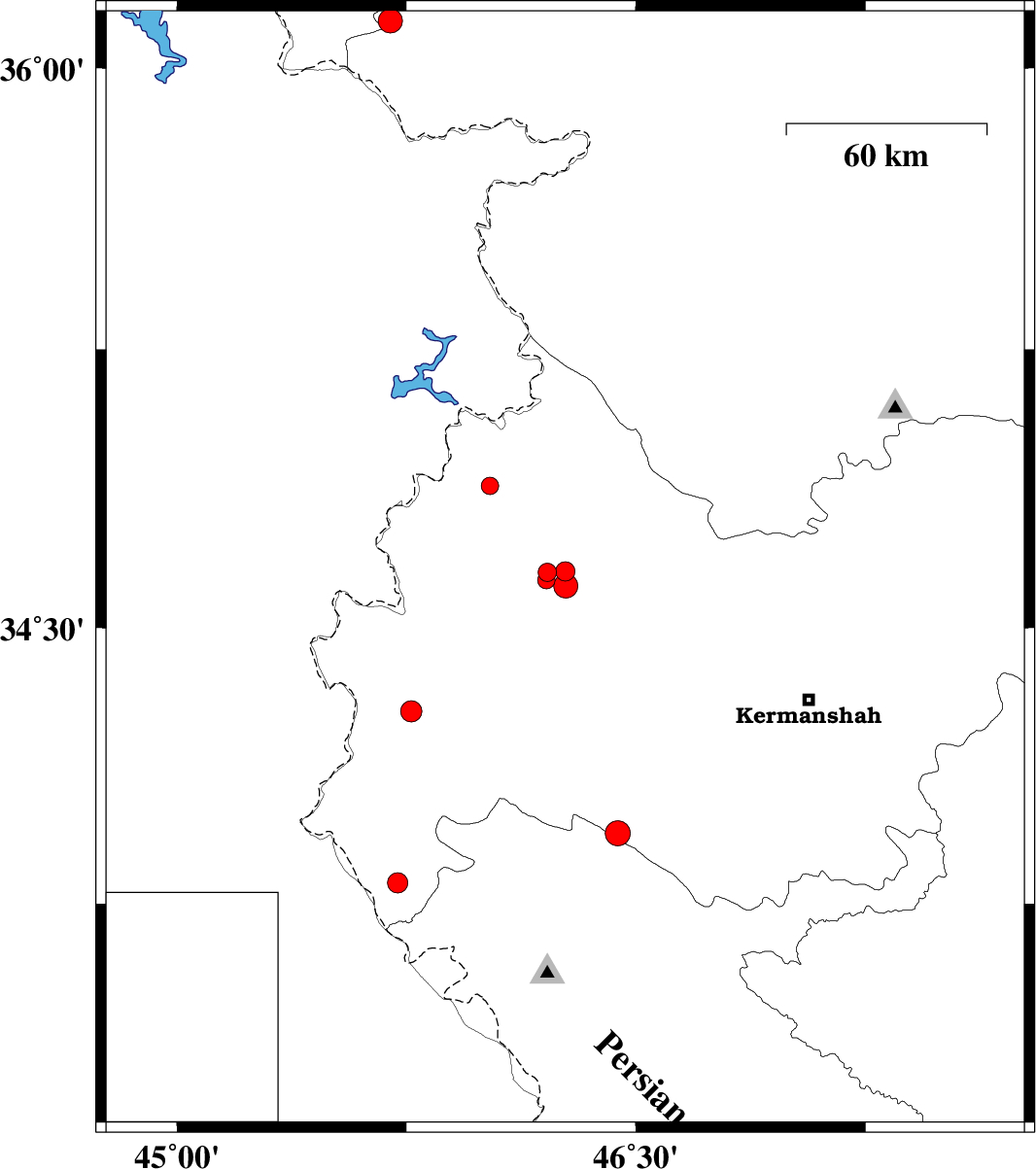 | 2018/11/01 | 15:30:46.7 | 19:00:46.7 | 34.274 | 45.766 | 14 | ML:3.1 | Kermanshah Province, 20 km North-West of Gilan-E-Gharb | ||