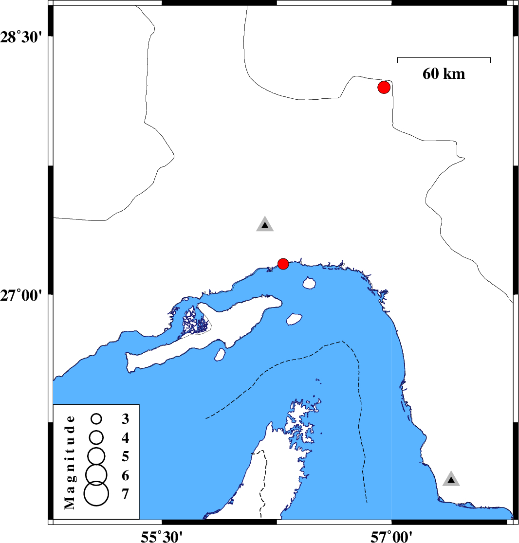 | 2018/11/06 | 04:14:42.8 | 07:44:42.8 | 28.203 | 56.949 | 14 | ML:3.7 | Hormozgan Province, 78 km North-West of Kahnuj |