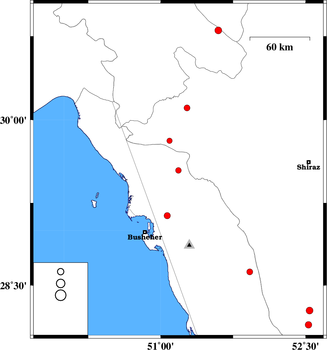 | 2018/11/04 | 15:22:23.1 | 18:52:23.1 | 29.812 | 51.092 | 14 | ML:2.5 | Fars Province, 62 km North-West of Borazjan | ||