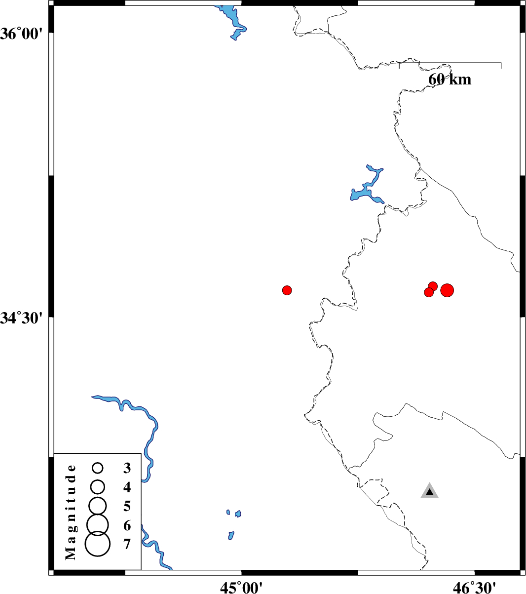| 2018/11/16 | 15:50:29.4 | 19:20:29.4 | 34.642 | 45.292 | 15 | ML:2.7 | Iraq, 30 km North-West of Qasr-E-Shirin | ||