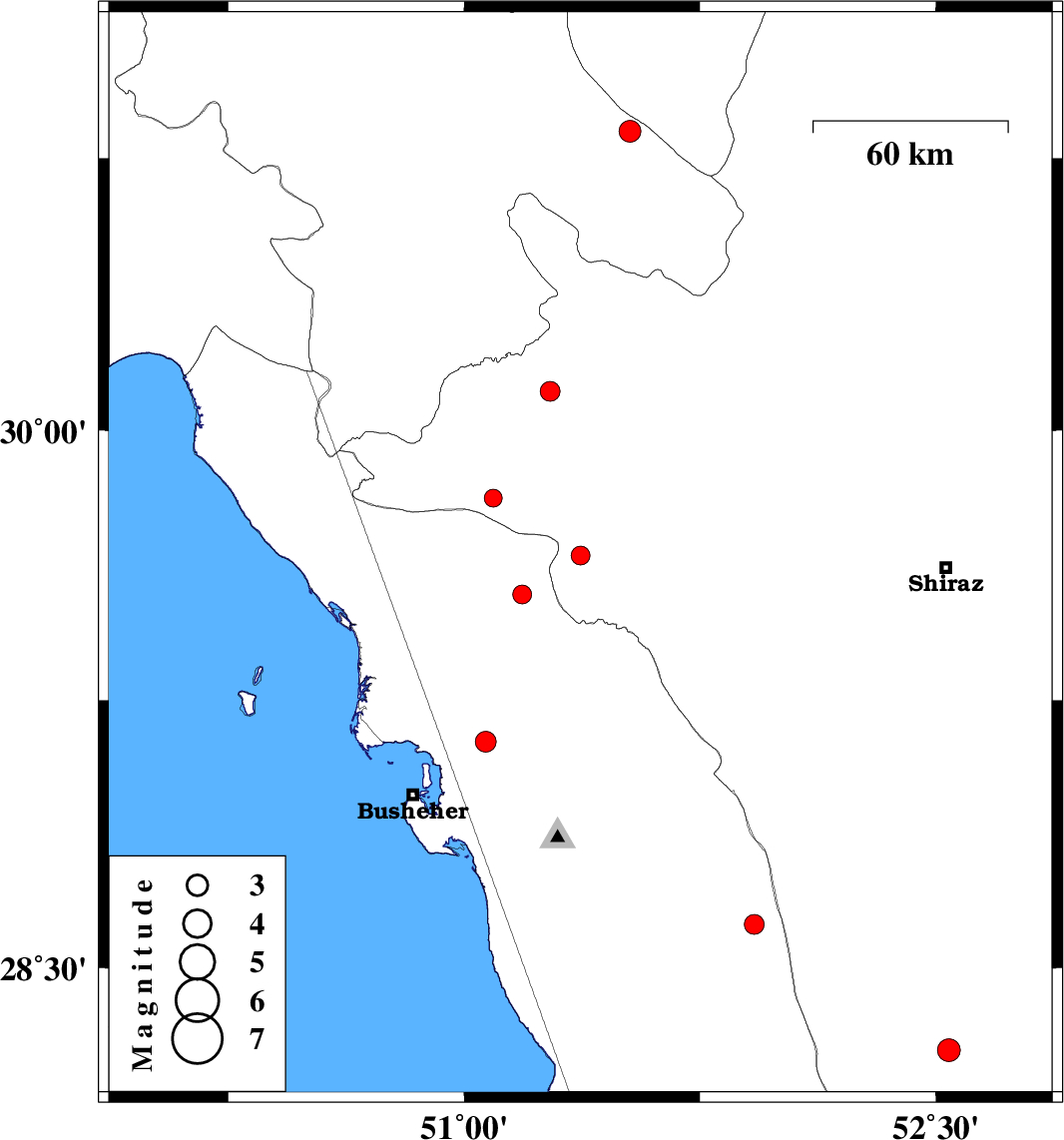 | 2018/10/21 | 04:28:23.7 | 07:58:23.7 | 29.134 | 51.069 | 14 | ML:2.9 | Bushehr Province, 19 km South-West of Borazjan | ||