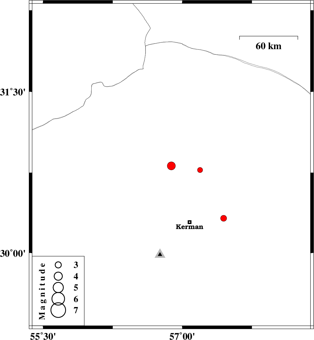 | 2018/11/25 | 04:44:26.1 | 08:14:26.1 | 30.813 | 56.882 | 14 | ML:3.9 | Kerman Province, 30 km -East of Zarand | ||