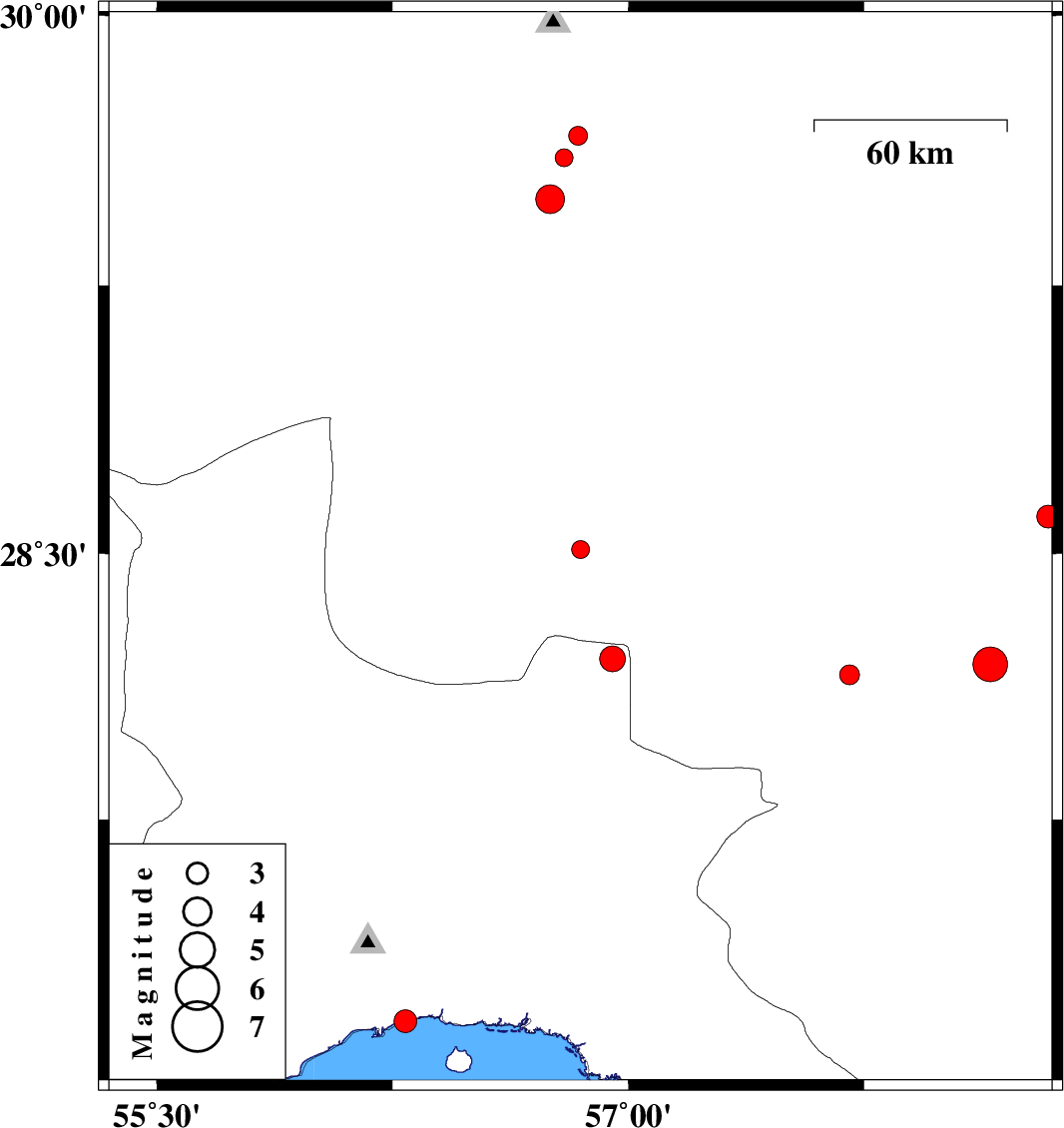 | 2018/11/04 | 02:13:08.1 | 05:43:08.1 | 28.603 | 58.336 | 14 | ML:3.3 | Kerman Province, 56 km South of Bam |