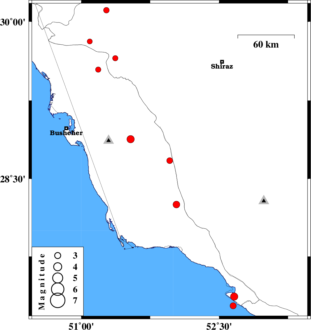 | 2018/11/26 | 00:49:47.5 | 04:19:47.5 | 28.88 | 51.536 | 10 | ML:3.7 | Bushehr Province, 27 km -East of Ahram | ||
