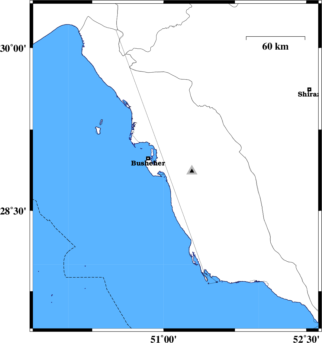 | 2018/11/26 | 00:49:47.5 | 04:19:47.5 | 28.88 | 51.536 | 10 | ML:3.7 | Bushehr Province, 27 km -East of Ahram |