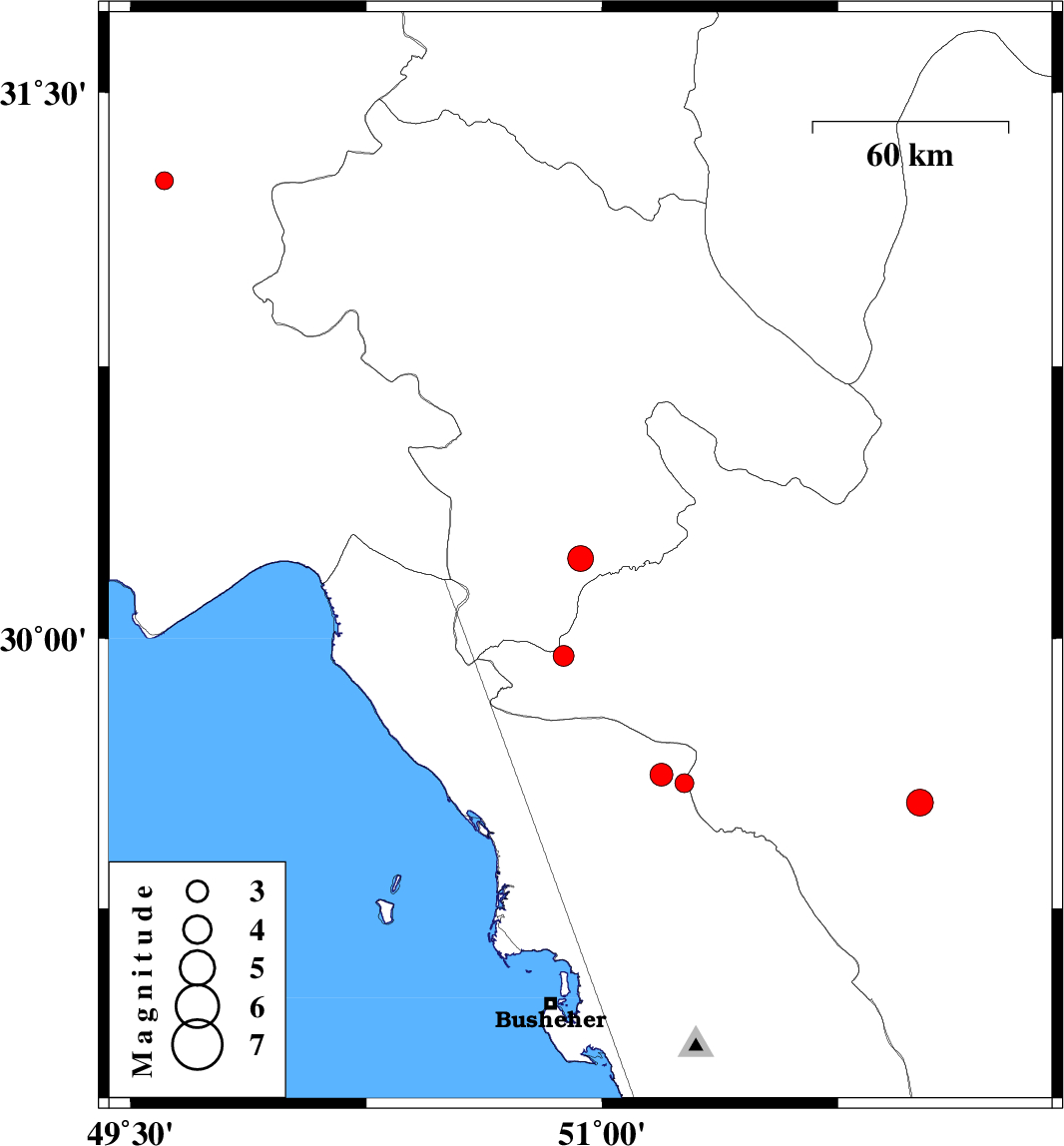 | 2018/12/13 | 17:05:25.7 | 20:35:25.7 | 29.622 | 51.188 | 15 | ML:3.2 | Bushehr Province, 40 km North of Borazjan | ||