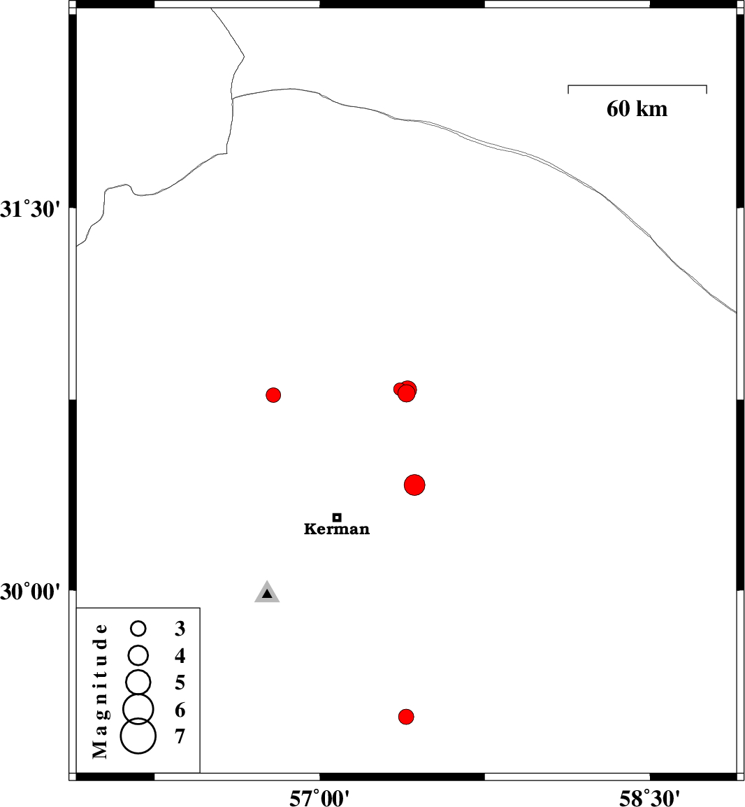 | 2018/12/11 | 01:41:01.5 | 05:11:01.5 | 30.416 | 57.431 | 14 | ML:4.2 | Kerman Province, 37 km North-East of Kerman | ||