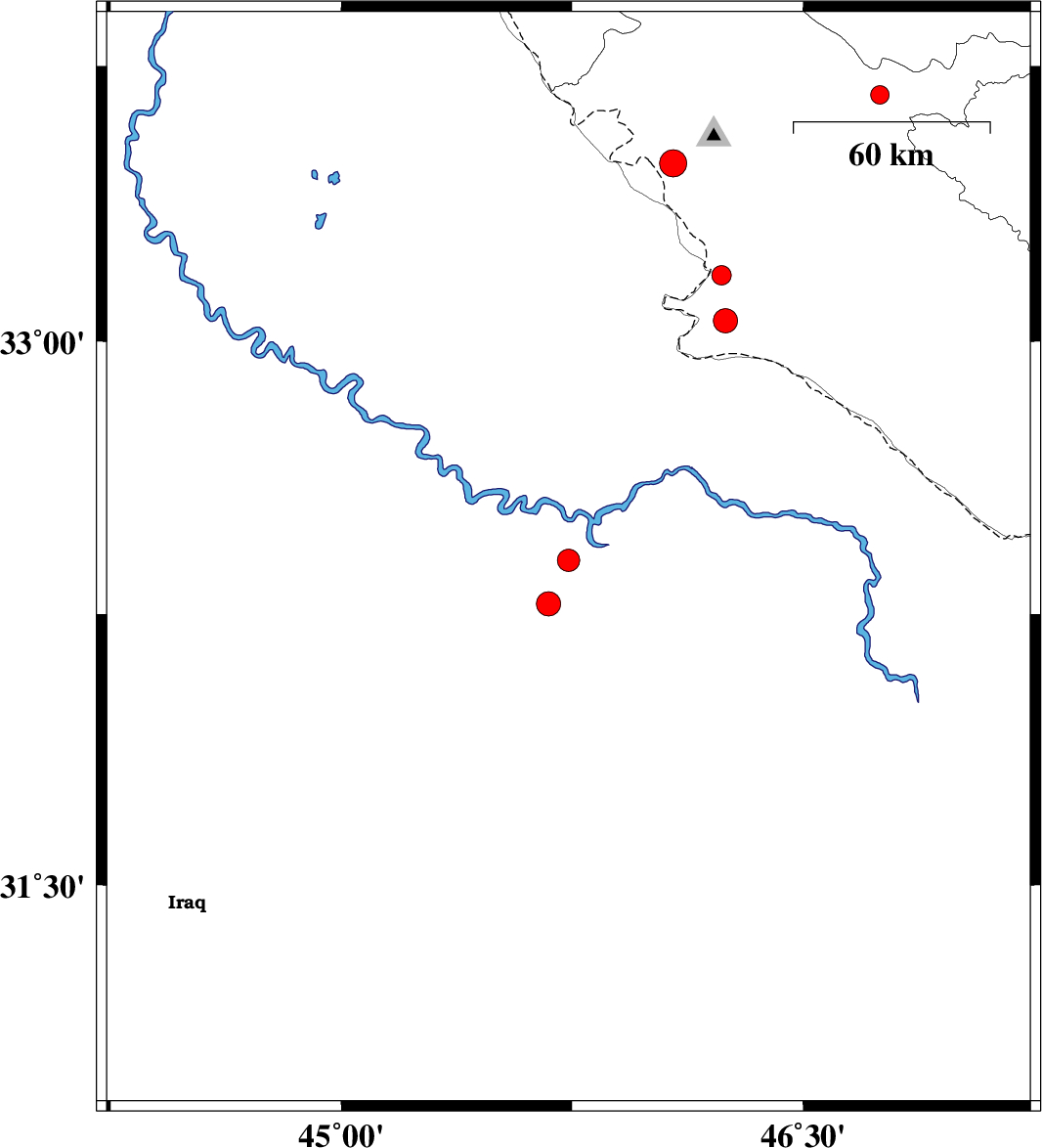 | 2018/12/12 | 23:44:01.1 | 03:14:01.1 | 32.279 | 45.673 | 14 | ML:3.5 | Iraq | ||