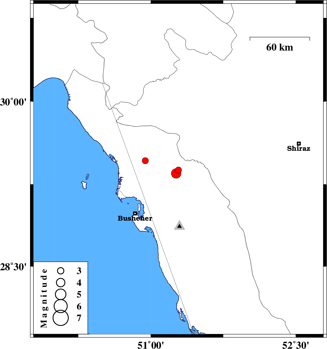 | 2018/12/29 | 15:20:58.0 | 18:50:58.0 | 29.464 | 50.944 | 14 | ML:3 | Bushehr Province, 34 km North-West of Borazjan |