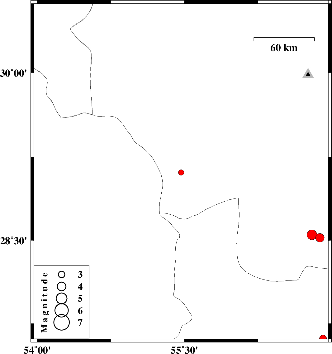 | 2019/01/27 | 11:20:02.3 | 14:50:02.3 | 29.11 | 55.467 | 18 | ML:2.6 | Kerman Province, 42 km South-West of Sirjan | ||