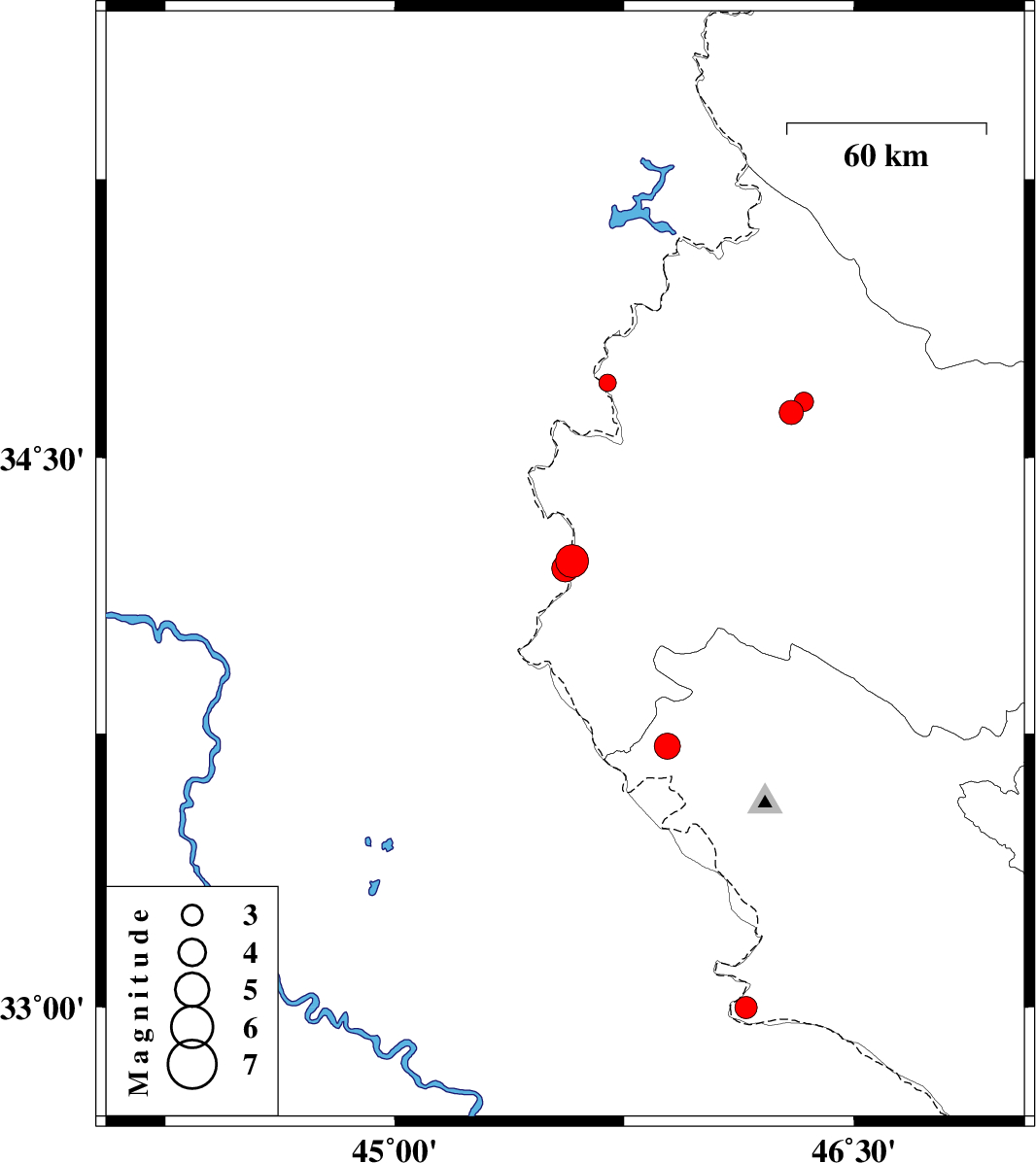 | 2019/03/12 | 12:05:18.0 | 15:35:18.0 | 34.2 | 45.557 | 14 | ML:3.9 | Iraq, 35 km South of Qasr-E-Shirin | ||