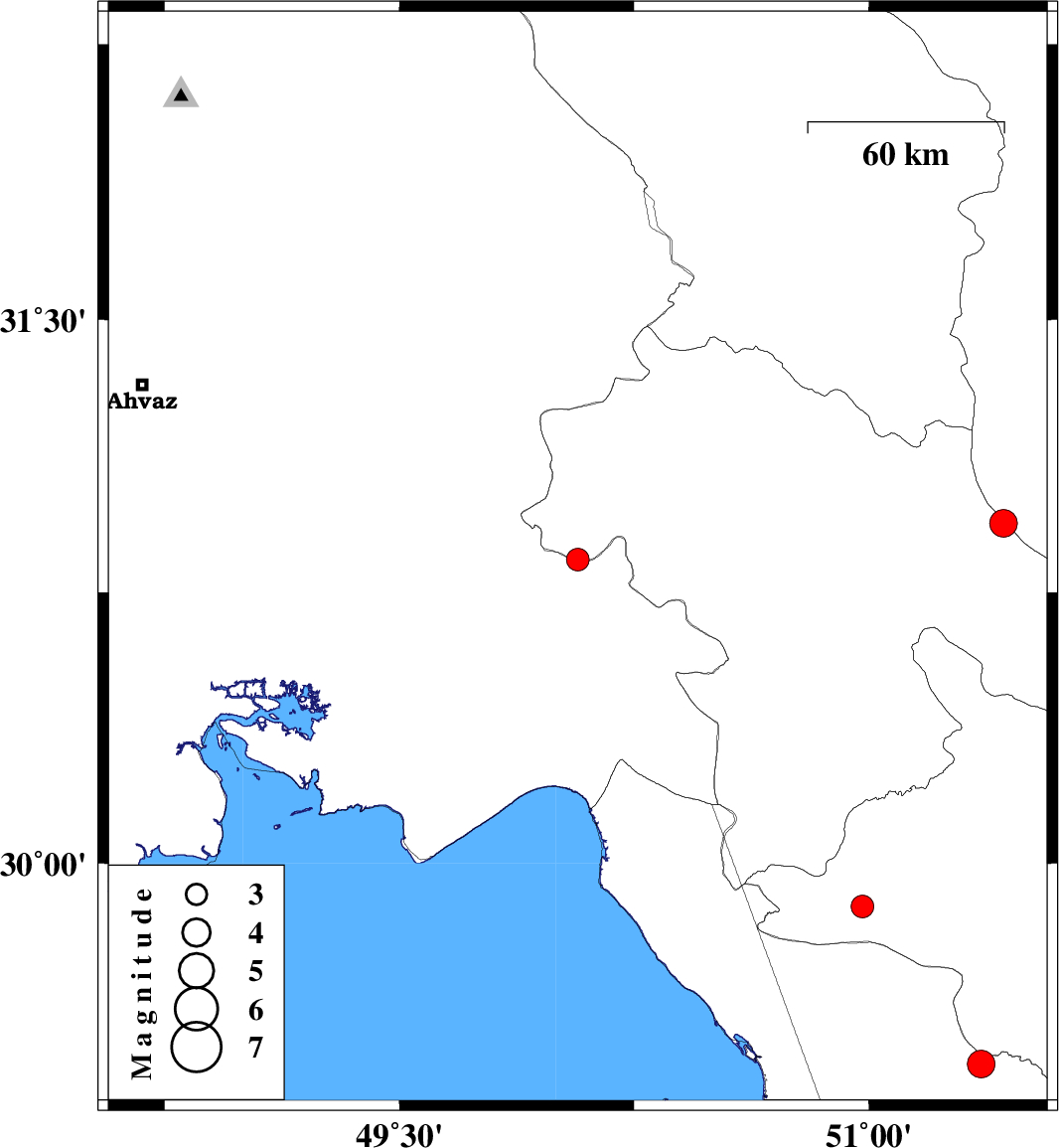 | 2019/04/25 | 01:16:43.7 | 05:46:43.7 | 30.84 | 50.07 | 17 | ML:3.3 | Kohkiluieh va boyerahmad Province, 32 km North-West of Behbahan | ||