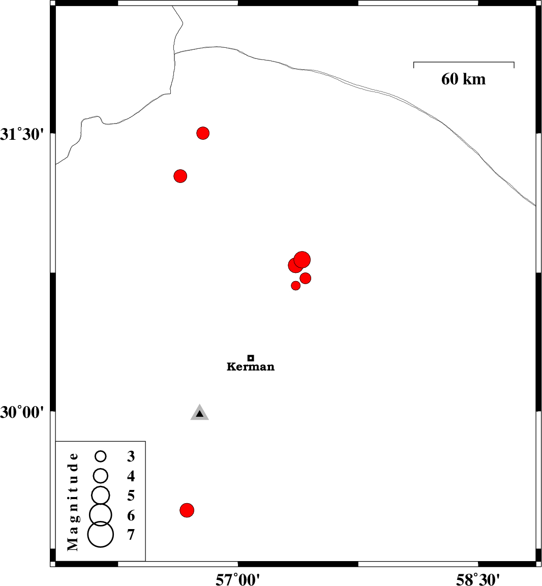 | 2019/04/16 | 22:43:48.4 | 03:13:48.4 | 30.79 | 57.36 | 10 | Mb:4.3 | Kerman Province, 62 km North-East of Kerman |