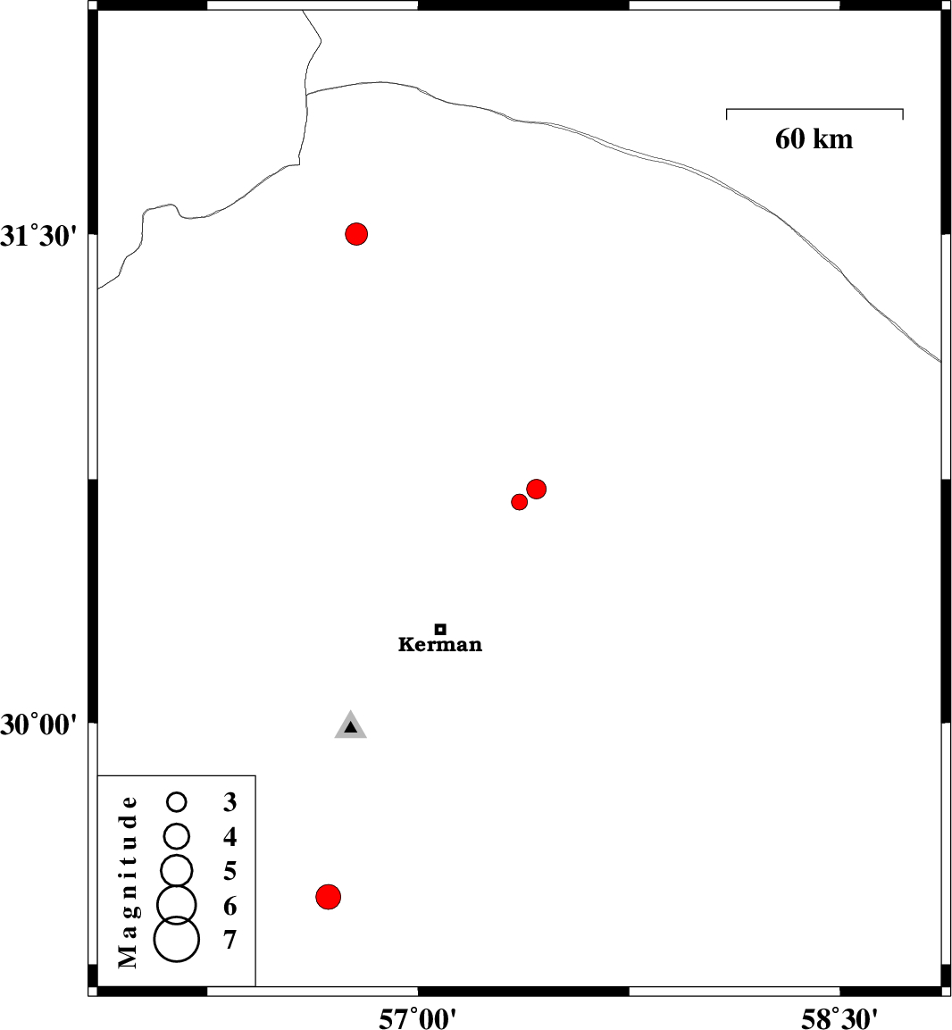 | 2019/05/12 | 16:40:03.0 | 21:10:03.0 | 30.72 | 57.42 | 10 | ML:3.1 | Kerman Province, 58 km North-East of Kerman | ||