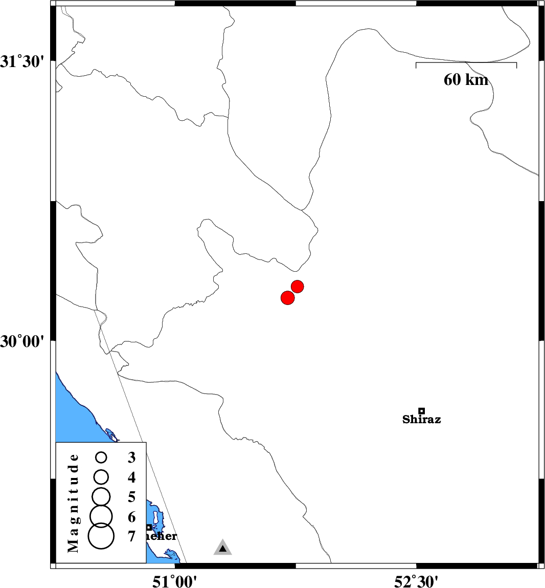 | 2019/06/01 | 23:41:33.6 | 04:11:33.6 | 30.23 | 51.7 | 12 | Mb:3.8 | Fars Province, 21 km North-East of Nurabad | ||