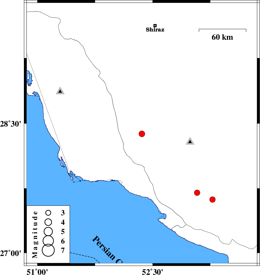 | 2019/06/15 | 07:46:44.8 | 12:16:44.8 | 28.38 | 52.36 | 18 | ML:3.5 | Fars Province, 61 km North of Jam | ||