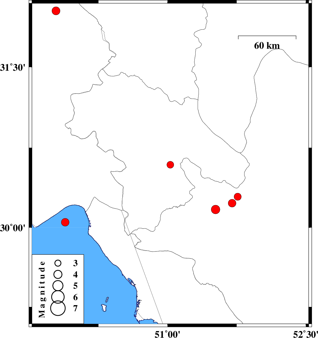 | 2019/06/01 | 23:41:33.6 | 04:11:33.6 | 30.23 | 51.7 | 12 | Mb:3.8 | Fars Province, 21 km North-East of Nurabad | ||