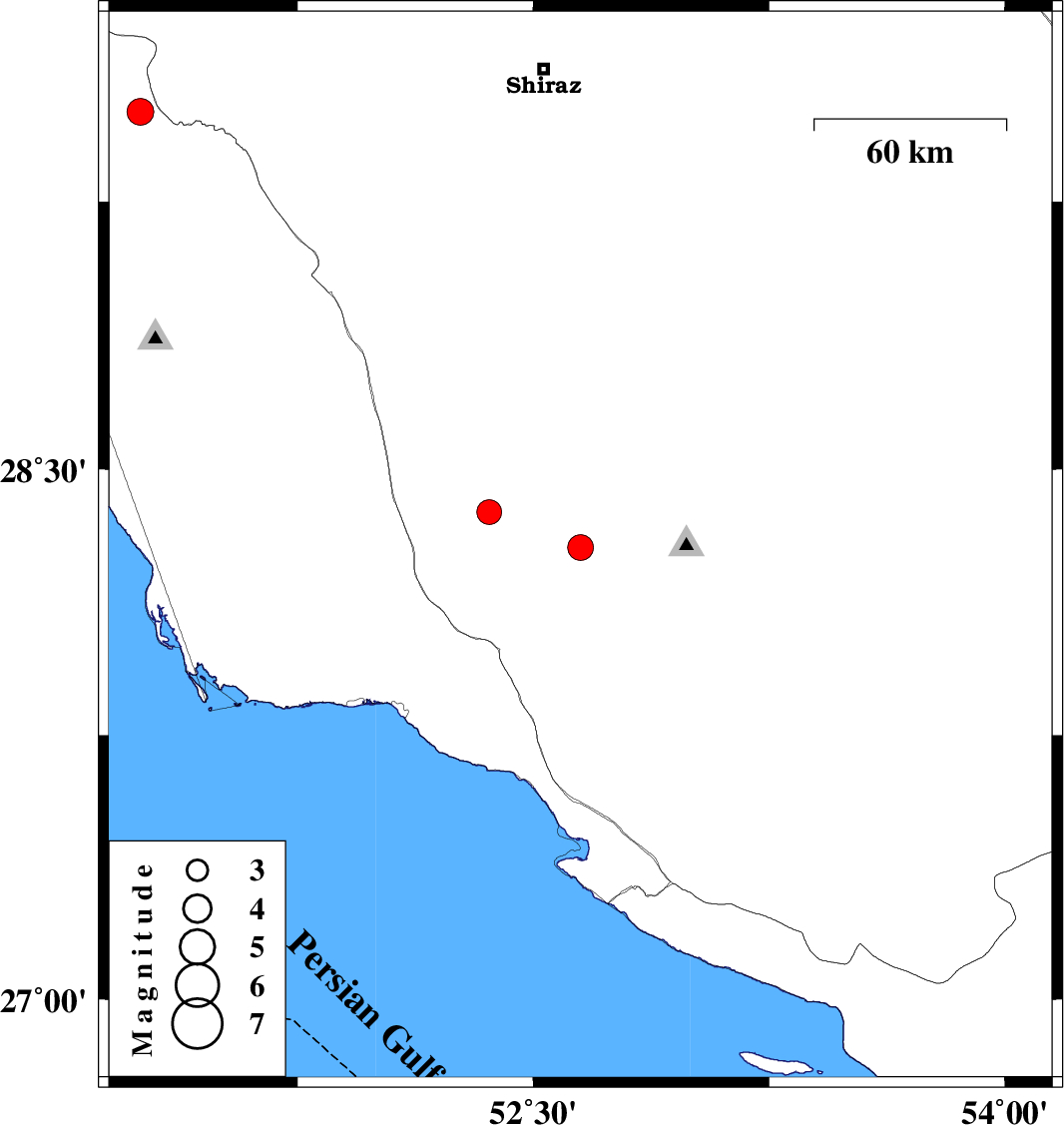 | 2019/06/15 | 07:46:44.8 | 12:16:44.8 | 28.38 | 52.36 | 18 | ML:3.5 | Fars Province, 61 km North of Jam |