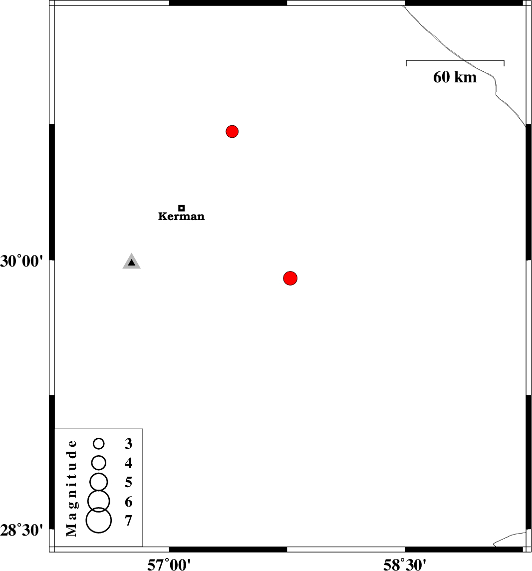 | 2019/06/24 | 21:02:00.7 | 01:32:00.7 | 29.9 | 57.77 | 9 | Mb:3.9 | Kerman Province, 79 km South-East of Kerman | ||