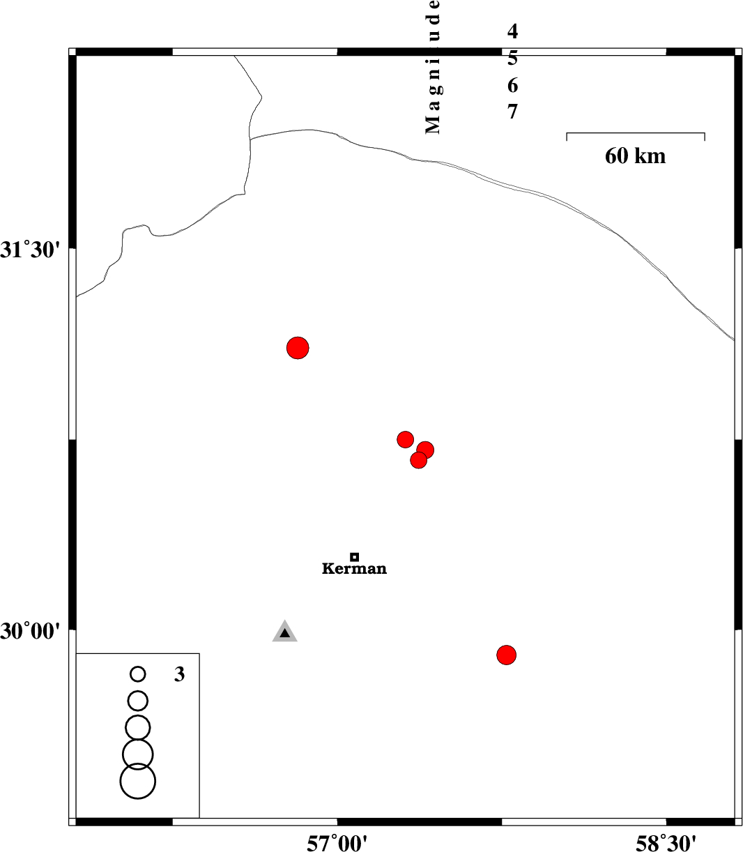 | 2019/06/24 | 21:02:00.7 | 01:32:00.7 | 29.9 | 57.77 | 9 | Mb:3.9 | Kerman Province, 79 km South-East of Kerman | ||