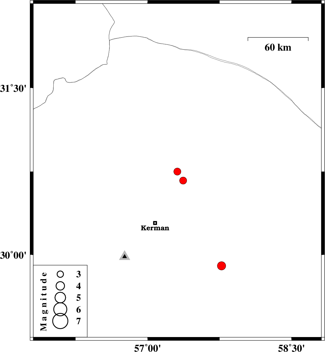 | 2019/06/24 | 21:02:00.7 | 01:32:00.7 | 29.9 | 57.77 | 9 | Mb:3.9 | Kerman Province, 79 km South-East of Kerman |