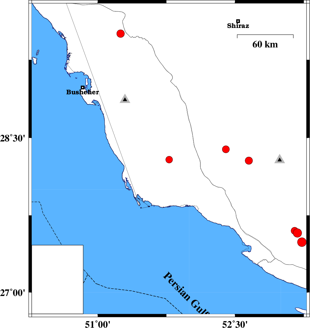 | 2019/06/22 | 01:34:53.5 | 06:04:53.5 | 29.5 | 51.25 | 10 | ML:3.8 | Bushehr Province, 27 km North of Borazjan |