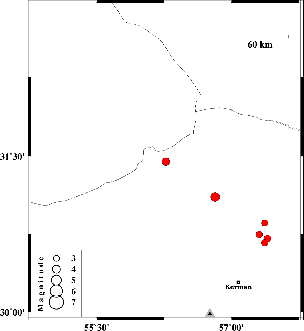 | 2019/06/18 | 12:02:49.4 | 16:32:49.4 | 30.71 | 57.4 | 14 | ML:3.5 | Kerman Province, 56 km North-East of Kerman | ||