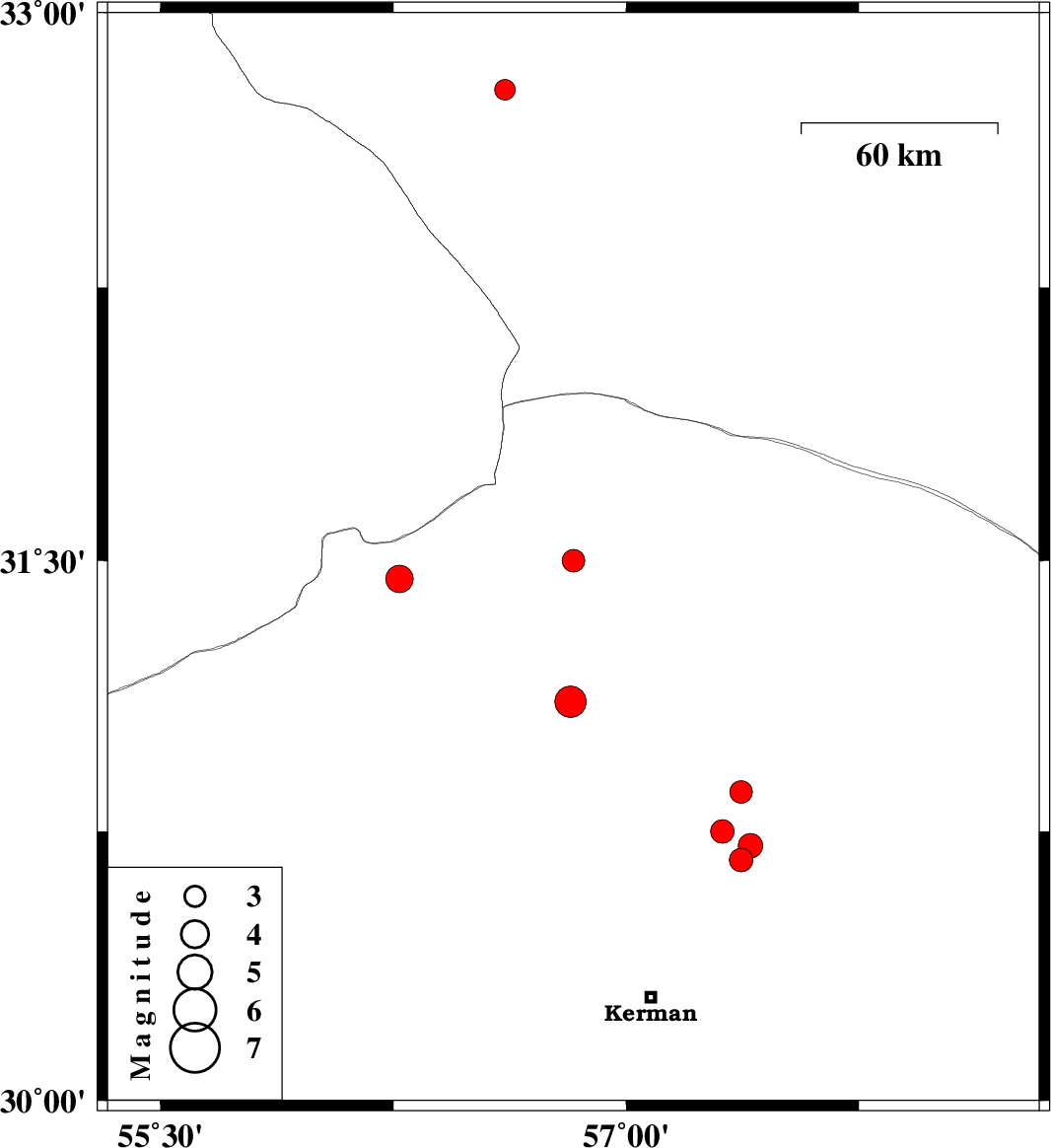 | 2019/07/06 | 07:28:22.7 | 11:58:22.7 | 31.5 | 56.83 | 14 | ML:3.3 | Kerman Province, 26 km North of Ravar | ||