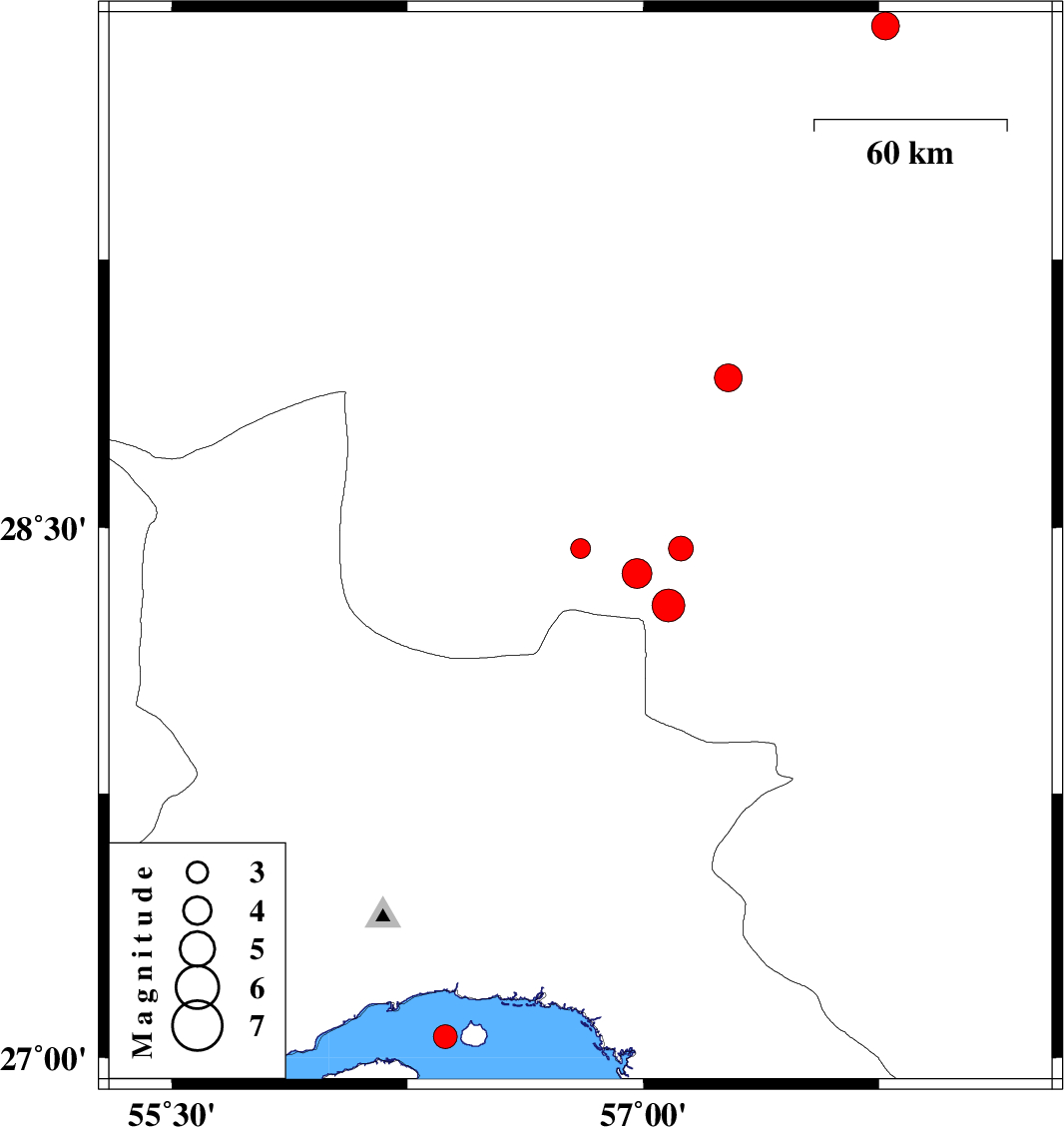| 2019/07/19 | 21:45:42.2 | 02:15:42.2 | 28.92 | 57.27 | 107 | ML:3.9 | Kerman Province, 54 km North-West of Jiroft | ||