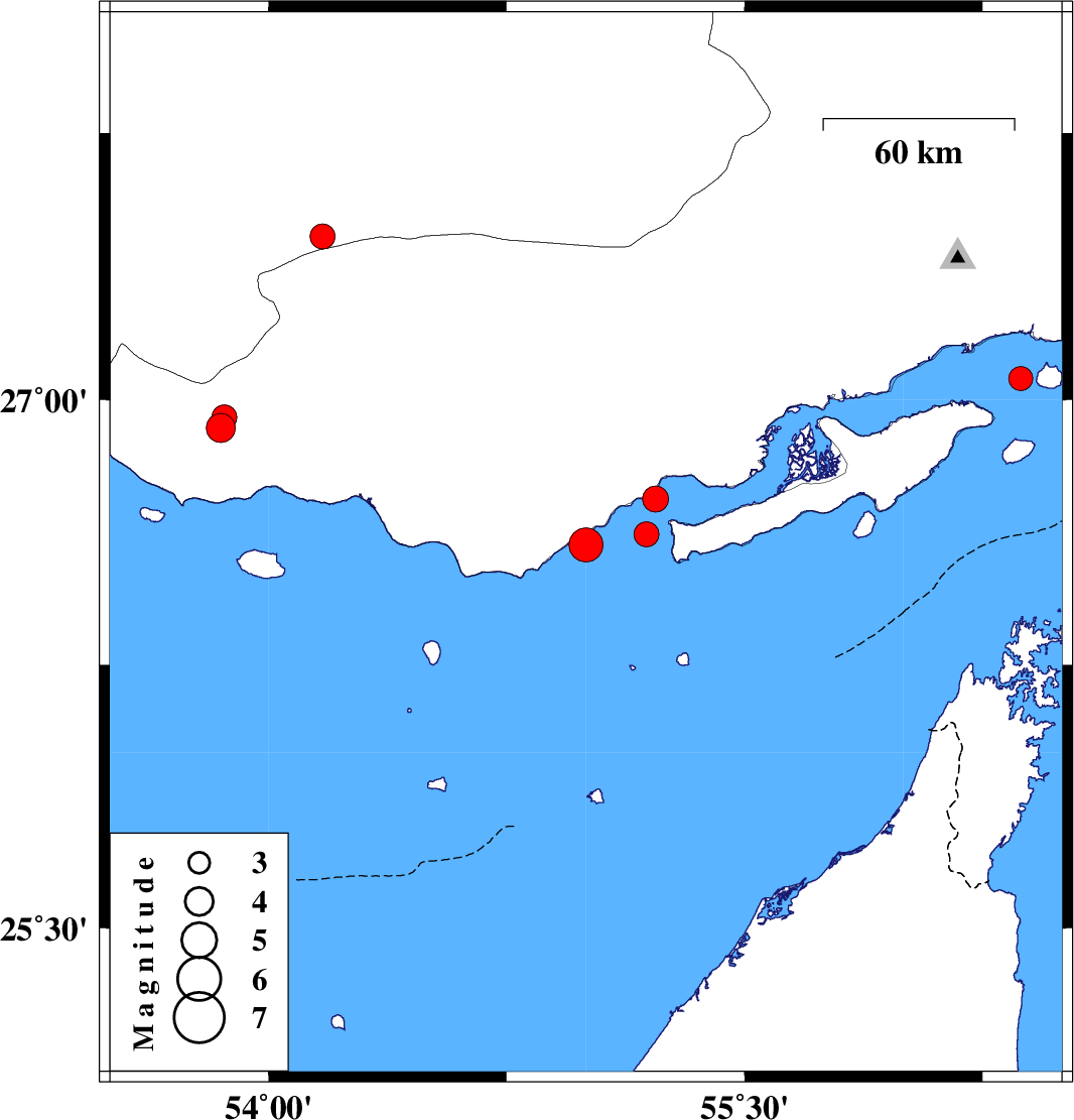 | 2019/07/22 | 23:20:39.9 | 03:50:39.9 | 26.72 | 55.22 | 14 | ML:3.6 | Persian Gulf, 43 km North-East of Bandar-e lengeh | ||