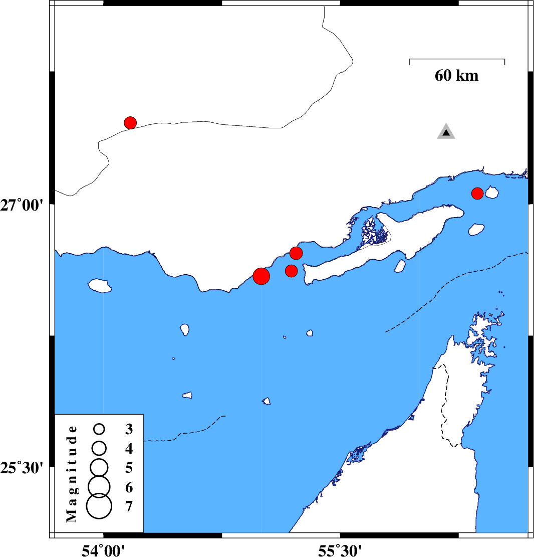 | 2019/07/22 | 23:20:39.9 | 03:50:39.9 | 26.72 | 55.22 | 14 | ML:3.6 | Persian Gulf, 43 km North-East of Bandar-e lengeh | ||