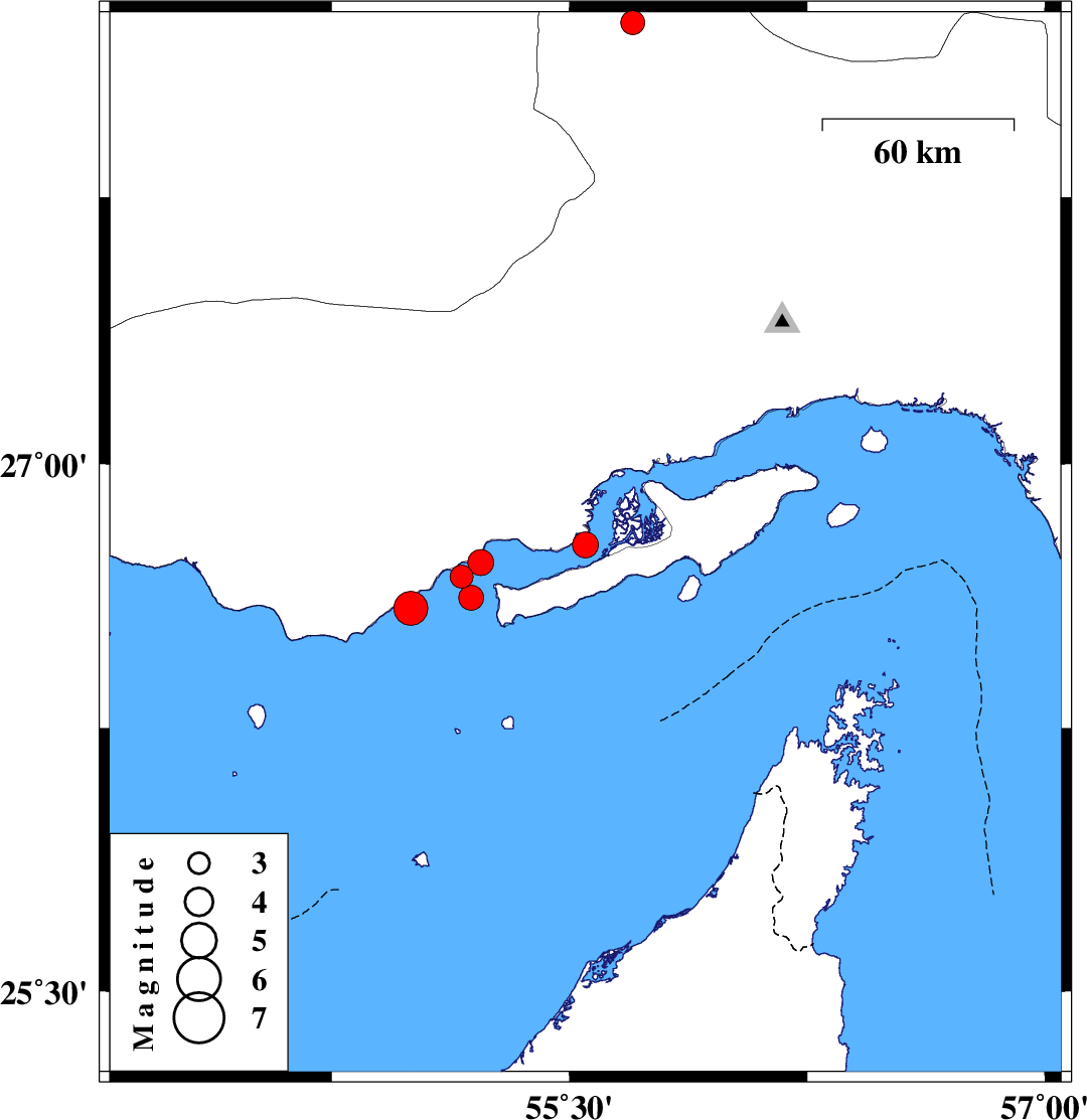 | 2019/07/22 | 23:20:39.9 | 03:50:39.9 | 26.72 | 55.22 | 14 | ML:3.6 | Persian Gulf, 43 km North-East of Bandar-e lengeh | ||